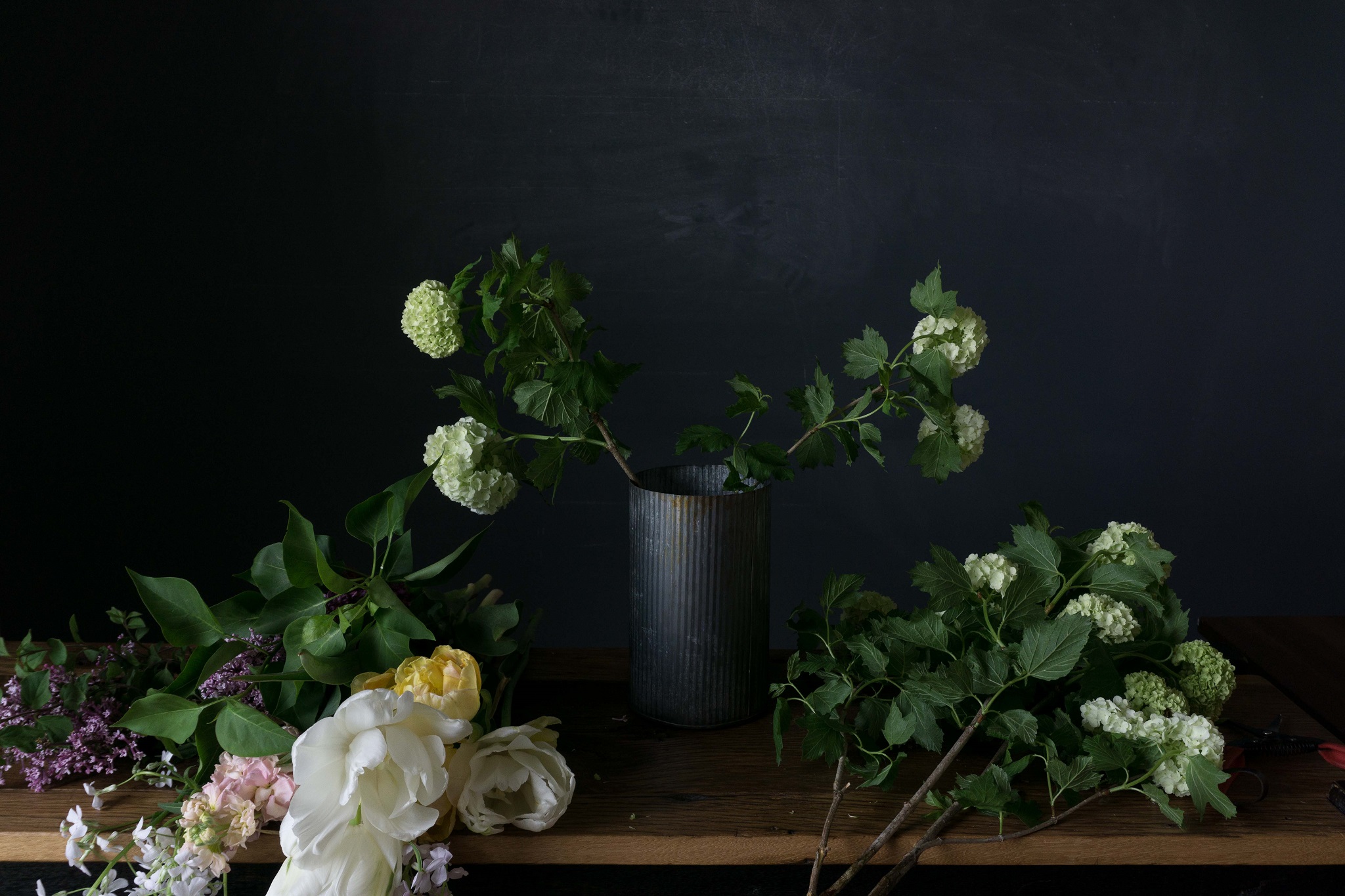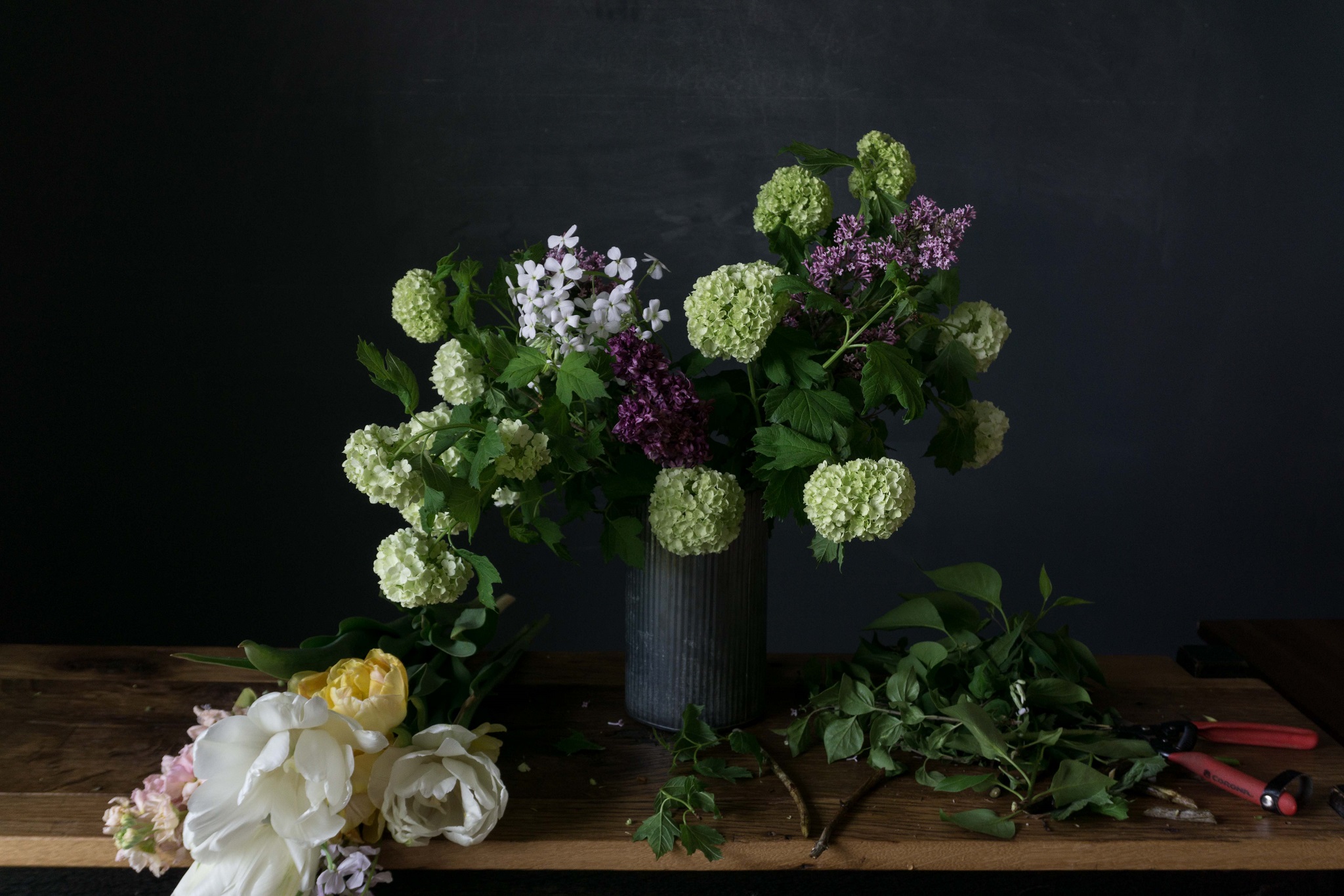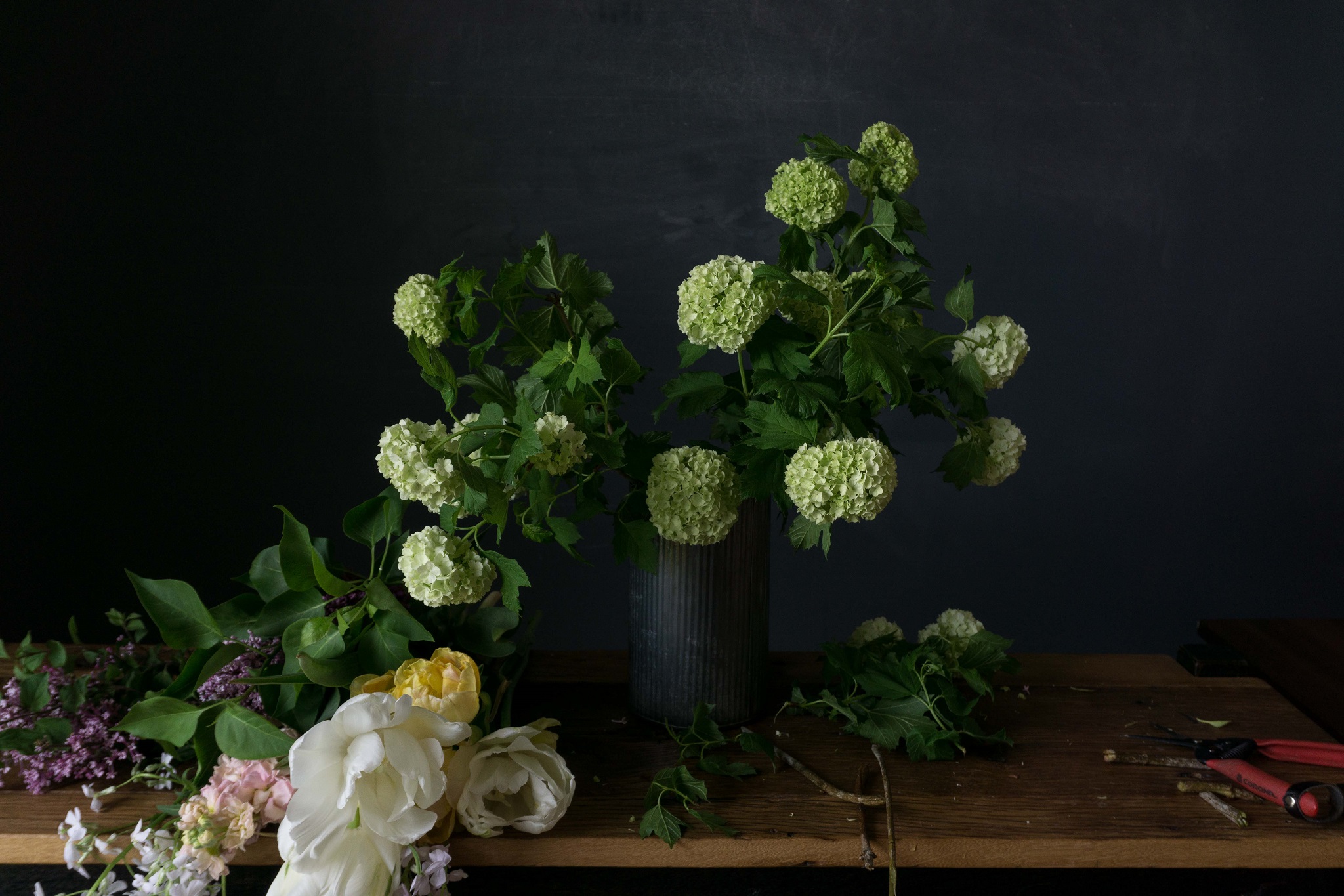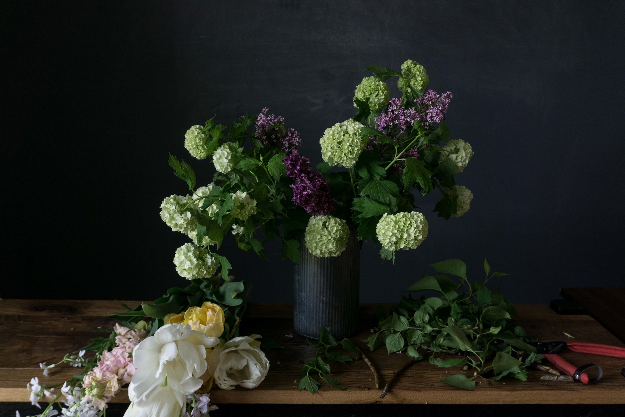Next, I sort the flowers by type, placing all the viburnum on a pile, all the lilac, and so forth.