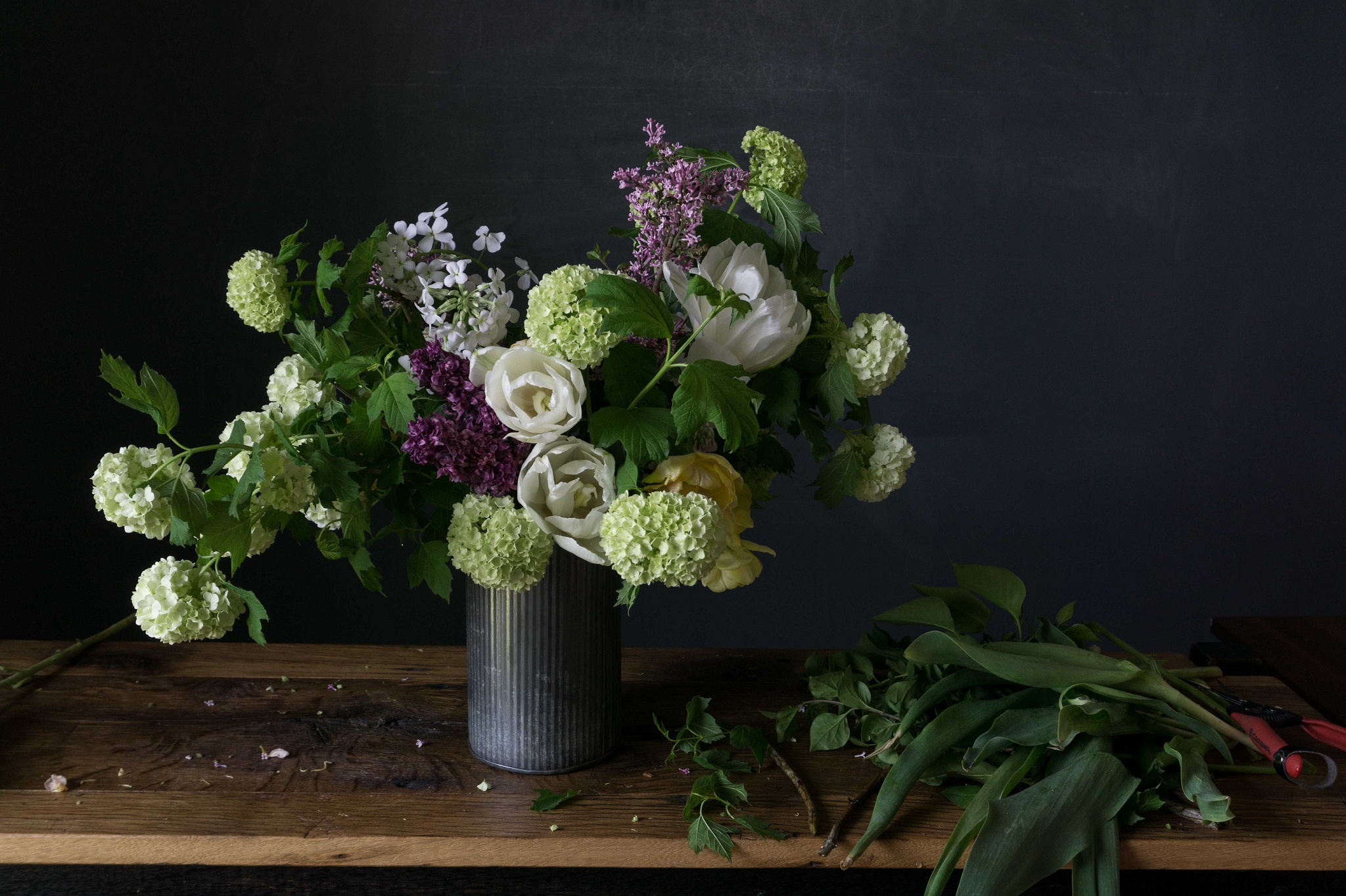 2. If your bouquet includes flowers and foliage with woody stems (a high likelihood when purchasing one from us!) be sure to make a vertical snip to split the stem at the base. Woody stems cannot drink through the bark so they will wilt quickly. Snipping them makes the water accessible for them. Some folks like to smash the stems of lilacs and viburnum with a hammer, but we find a snip or two up the base is sufficient hydration. Plus you don’t have to go hunting for your hammer.