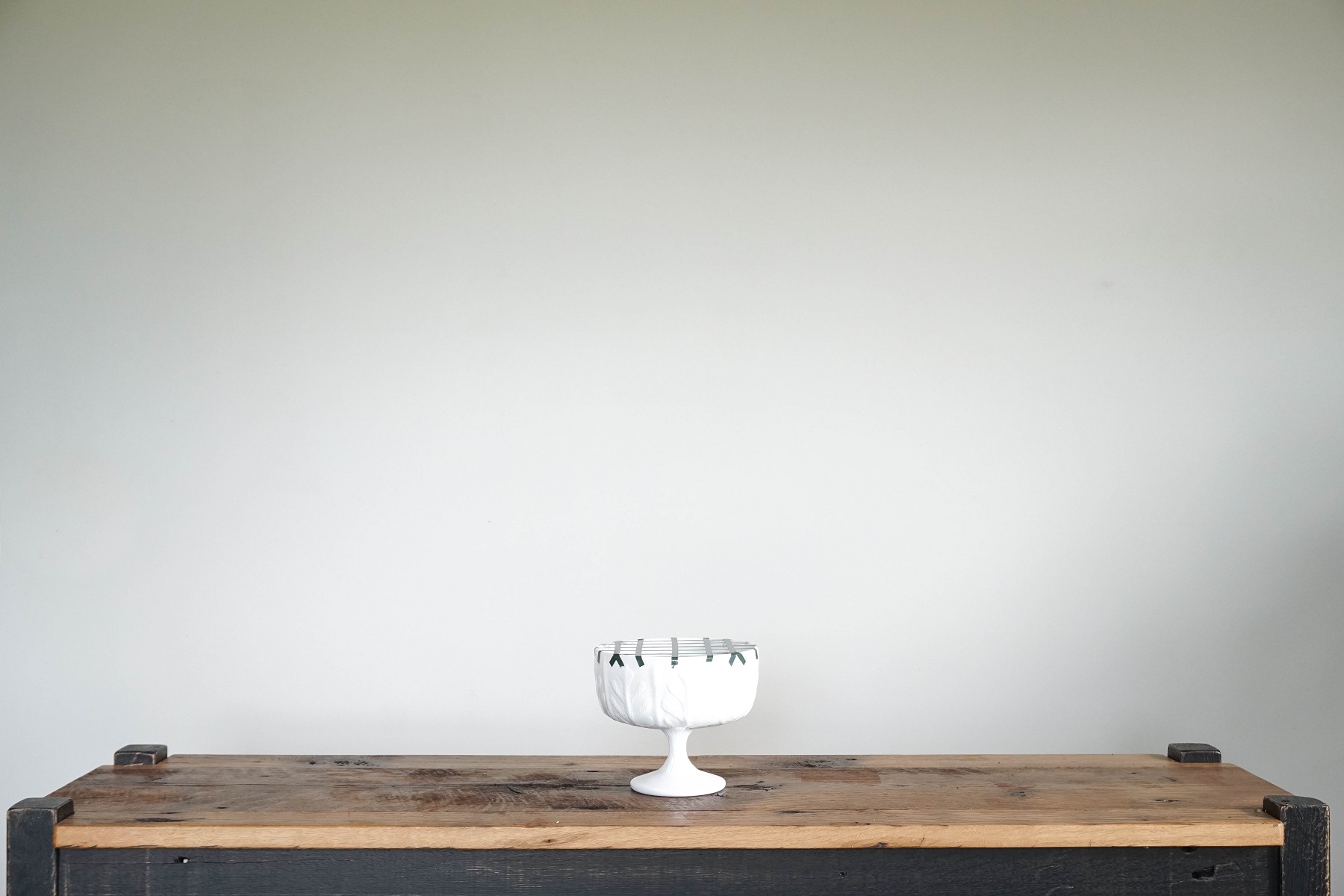Let’s start with the vase. I used a compote since I love how it lifts an arrangement high enough that some of the flowers can sweep down onto the table for a bit of dramatic flair. I used green florist’s tape to make a grid to support the flowers and I’ve also attached a pin frog to the bottom of the bowl since it’s a little tough to make tall things stay put in a shallow bowl. I forgot to get a picture of the frog, so if you’ve got a picture in your head of a little green amphibian with pins falling out of its mouth, search for ‘pin frog’ online. It’s not quite that scary, I promise.