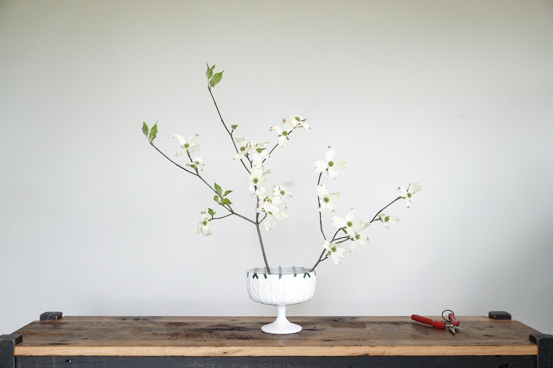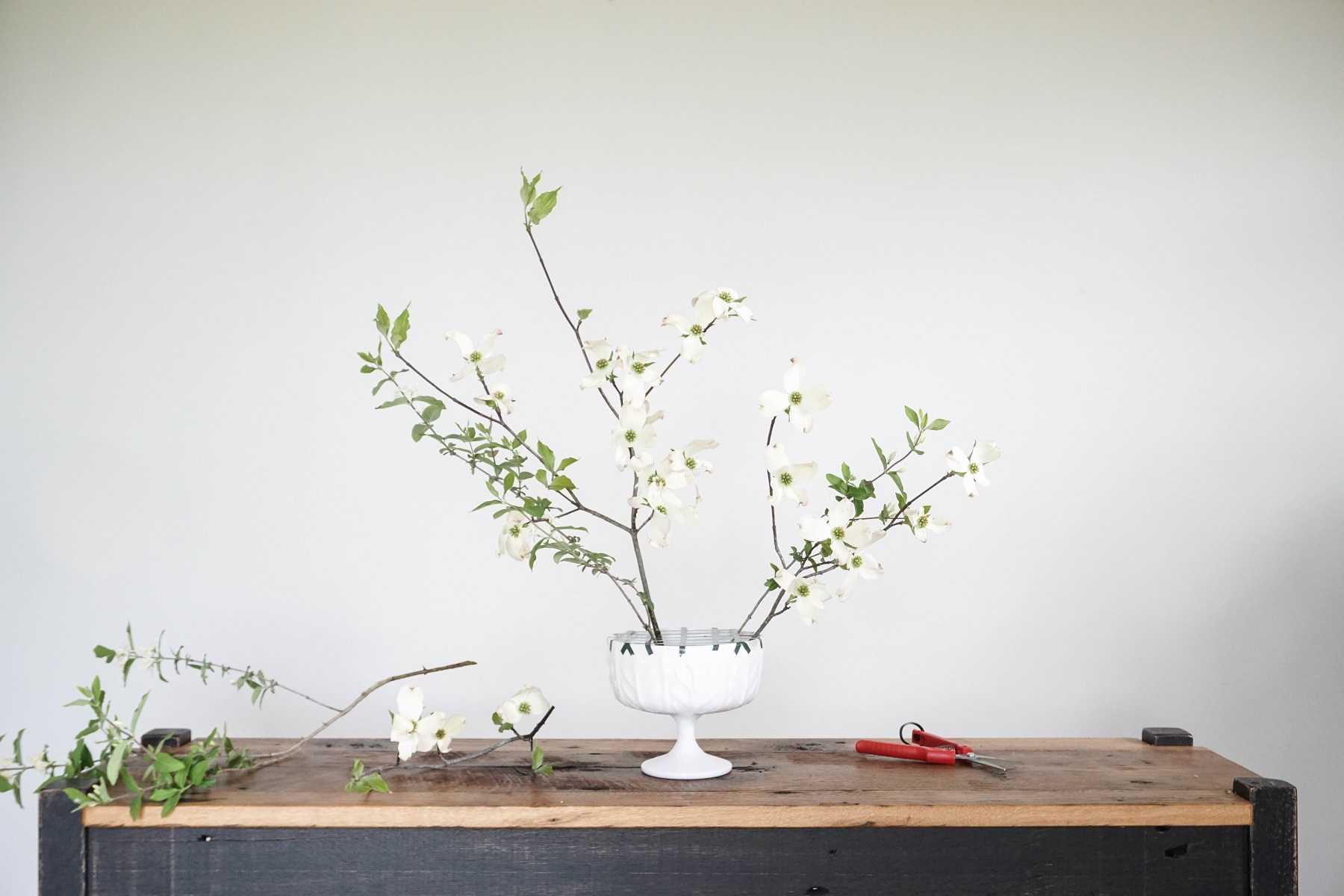 Another tip: woody stems can’t drink water through their bark, so if you split the stem about an inch up the bottom they’ll have a chance to drink and will last longer. I’d also recommend giving your flowers and foliage a fresh, diagonal cut before putting them into your vase.