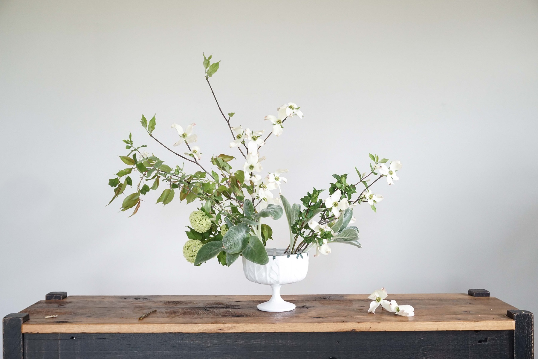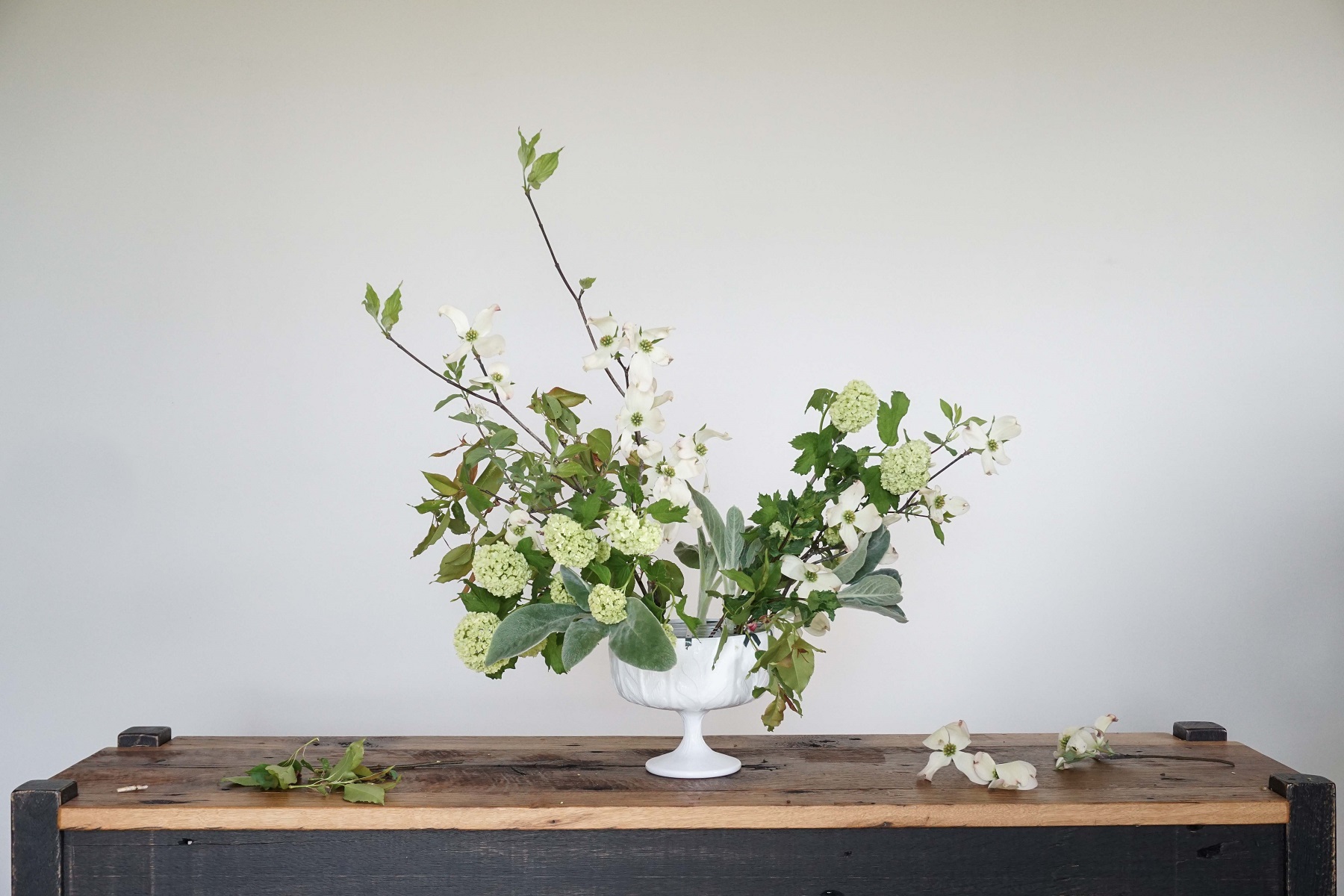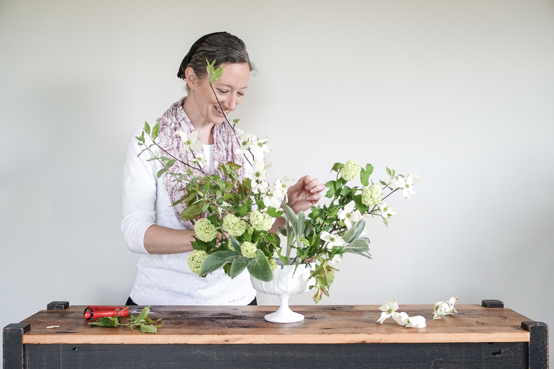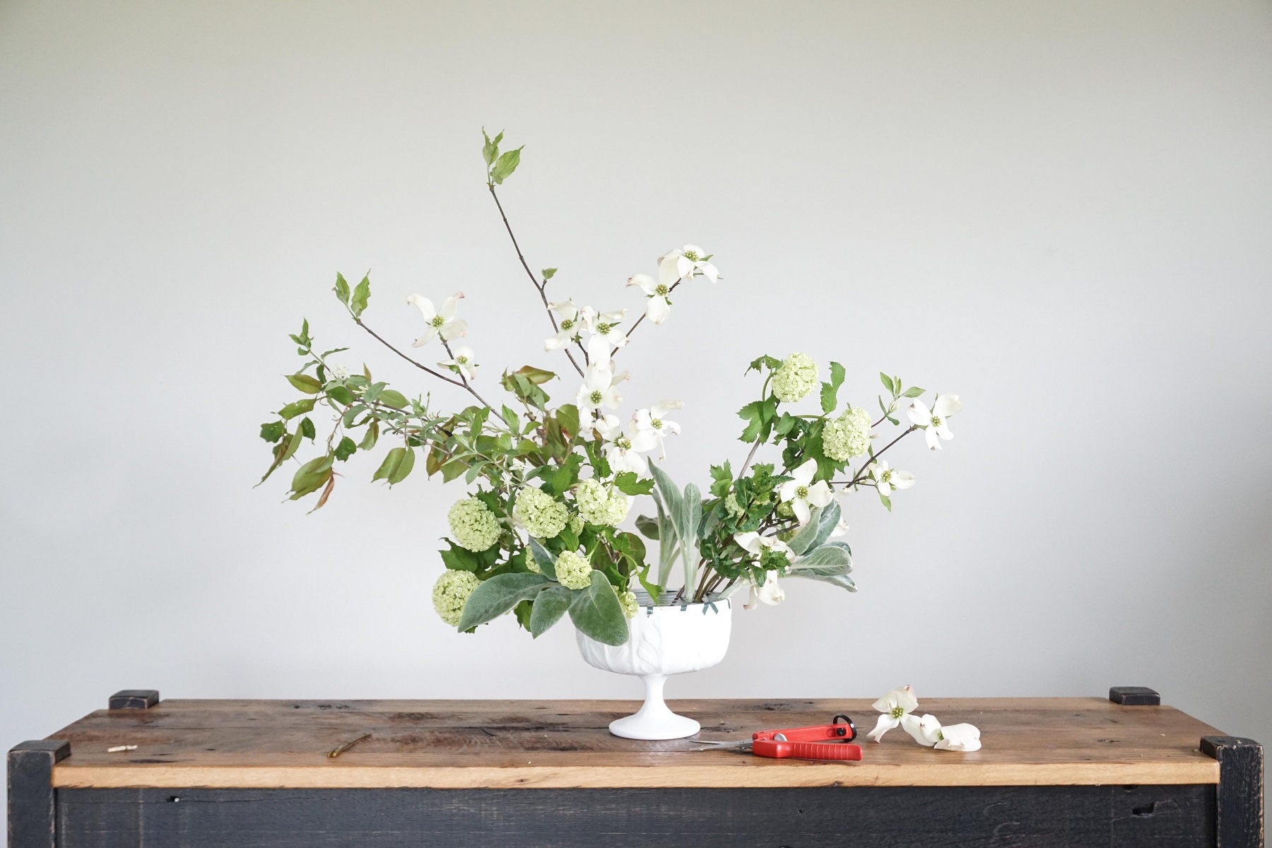 I like to occasionally take a step back and see what needs editing. Don’t be afraid to chop things down if it gets a bit bushy and out of control. I wanted this bouquet to feel light and airy and realized the greens on the left were just too long. I wanted those little dogwoods to dance up over the top of the arrangement.